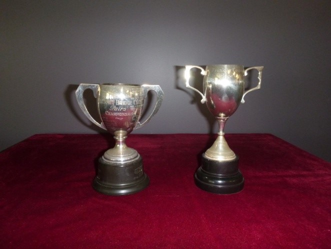 The Howes Cups are awarded to the Winner of the Monday Championship Pairs (The Howes Championship). The Cups were donated by Dr Alan and Mrs Majorie Howes in 1970. Dr and Mrs Howes established the Franklin Bridge Club in 1958. Dr Howes was in his 80’s when the Club celebrated its 50th birthday, and he spoke in great detail about the setting up of the Club and how Bridge has evolved in 50 years. They were prominent Bridge players attending tournaments throughout NZ and winners of the prestigious North Island Pairs. Dr Howes was President 1958, 1959 and 1960. Mrs Howes was President 1965, 1966, 1967, 1985 and 1986.